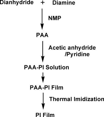 일반적으로는 PAA(polyamic acid)상태까지 중합하지만 분말로 석출하는 경우에는 이미드화까지 중합과정에서 진행되기도 한다. 일반적인 경우에는 PAA상태로 중합 후 필름화 공정을 거친 후 필름상에서 이미드화 과정을 거친다.